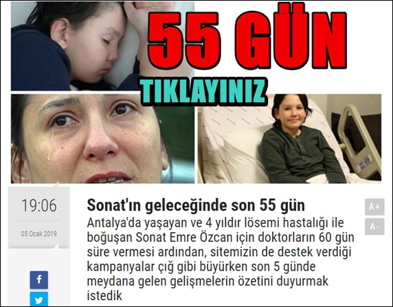 Antalya'da Akut Lenfoblastik Lösemi (ALL) hastalığıyla 4 yıldır savaşan 14 yaşındaki Sonat Emre Özcan, yaşama tutunabilmek için ilik nakli bekliyor. Bir çok vakada başarılı kampanyalar ile çok sayıda çocuğun hayatının kurtulduğu bu illet için yapmamız gereken çok basit. Sadece kan vermek. Eğer kan veremeyecekseniz bu çaresizliği sosyal medyada paylaşarak olabildiğince çok insana ulaşmasını sağlayalım.