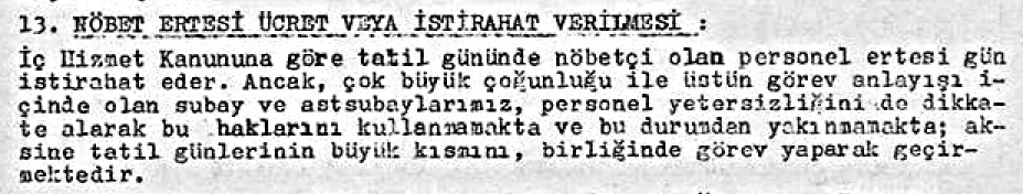 Assubayların en masum taleplerinden biri olan bu husus, tamamen duyguları sömürücü, görev yoğunluğu, personel yetersizliği ve assubayların mevcut istirahat haklarını kullanmamakta olduklarından, hatta tatil günlerinde bile mesai yapmaktan şikayetçi olmadıklarından bahisle bu madde geçiştirilmeye çalışılmış.