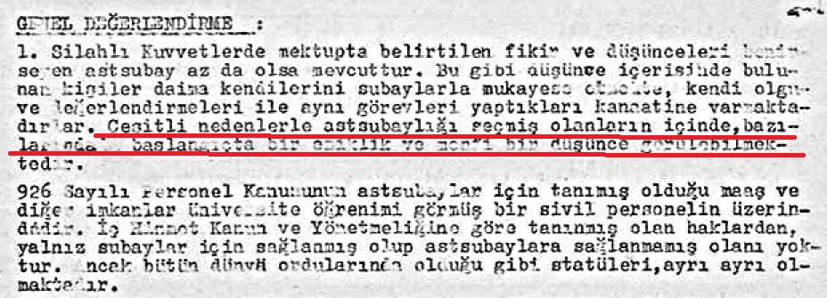 Ve dananın kuyruğunun koptuğu yer! ÇEŞİTLİ NEDENELERLE ASSUBAYLIĞA GEÇENLERİN İÇİNDE, BAZILARINDA BAŞLANGIÇTA, BİR EZİKLİK VE MENFİ BİR DÜŞÜNCE GÖRÜLEBİLMEKTEYMİŞ. Evet yanlış okumadınız, 1985 yılında, Genelkurmay Başkanlığı, assubaylardan gelen şikayet mektuplarına istinaden bir çalışma yapıyor, cevap hazırlıyor ve yukarıdaki cümleyi gayet normalmiş gibi emire ekleyerek yazıyor ve birliklere tamim ettiriyor.
