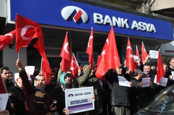 Bank Asya'nın yönetimine el konulması ve polis baskınını bankaya haksızlık olarak nitelendiren vatandaşlar, tepkilerinin süreceğini söyledi. 'Bank Asya Milletindir', 'Bir gün değil, her gün seninleyiz', 'Hangi çılgın Bank Asya'ya el koyacakmış şaşarım', 'Rıza'nın önüne değil, Bank Asya'nın önünde yatmaya geldik', 'Dert çekeriz para çekmeyiz' gibi pankartlar taşıyan yaklaşık 20 kişilik grup, dağıldı.