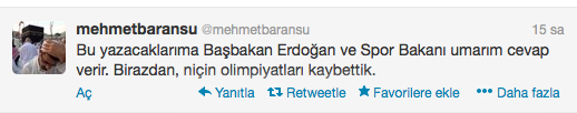 Mehmet BARANSU'nun, Olimpiyatların Tokyo'ya verilmesinden sonra, bizzat Başbakan Erdoğan'ı hedef alan tweetleri ortalığı karıştıracağa benziyor