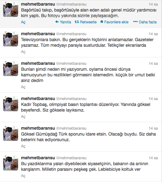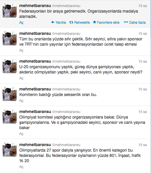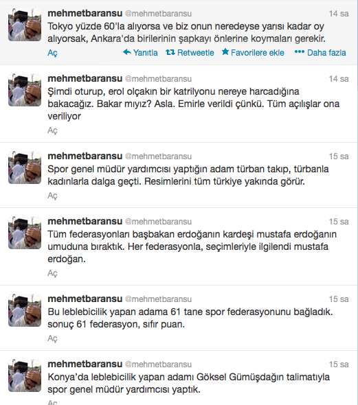 TARAF gazetesi yazarı Mehmet Baransu, Olimpiyat fiyaskosu sonrasında organizasyon düzenleme komitesi ve çalışmaları konusunda attığı tweetlerle ortalığı karıştırdı.
