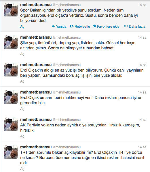 Başbakan bu ekibe inandı ve kandırdılar. Olimpiyat sonrası hesap sorar umarım. İlk sorması gerekli kişi kader arkadaşı Erol Olçak olmalı. Erol Olçaktan hesap sorar mı? Hiç zannetmiyorum. Türkiyedeki tüm organizasyonlar neden erol olçaka verilir AKPliler neden Erol Olçak'a, Erol .lçak der. Boş bıraktığım yere harfi siz koyun. Kaç milyon dolarlık iş aldı. Milyar mı deseydim Erol Olçak'ın TRT'ye borcunu kapatmak için niçin bütün organizasyonlar ona veriliyor. Milletin parası niçin peşkeş çekiliyor. Erol Olçak'ın devletten ihalesiz, zorla aldığı, ihale adı altında aldığı işleri Başbakan açıklayabilir mi? TRT'den sorumlu bakan açıklayabilir mi? Erol Olçak'ın TRT'ye borcu ne kadar? Borcunu ödememesine rağmen ikinci reklam ihalesini nasıl aldı. Erol Olçak umarım beni mahkemeyi verir. Daha reklam panosu işine girmedim bile. Erol Olçak'ın aldığı en az yüz işi ben biliyorum. Çünkü canlı yayınlarını ben yaptım. Samsundaki boru açılış işini bire yüze aldılar. Spor Bakanlığından bir yetkiliye şunu sordum. Neden tüm organizasyonu erol olçak'a verdiniz. Sustu, sonra benden daha iyi biliyorsun dedi.