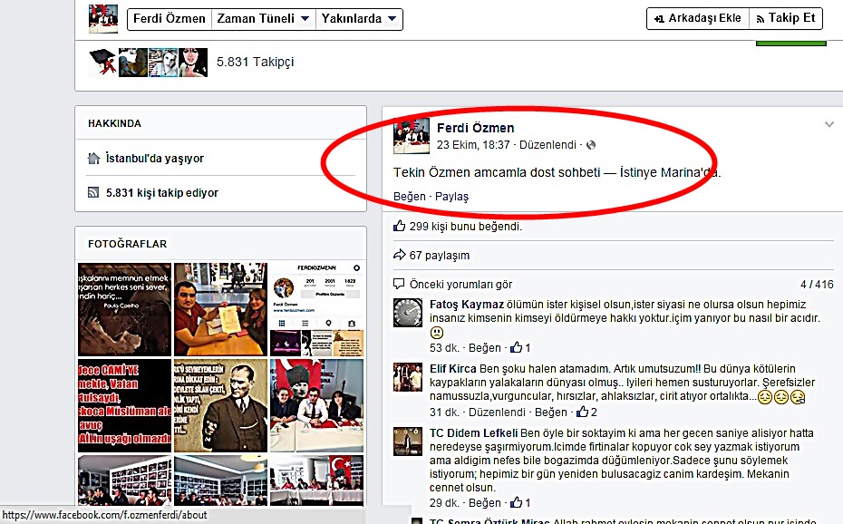 Sosyal medyada Atatürkçü kimliği ile tanınan ve yüzbinleri aşan takipçileri ile fenomen haline gelen İnternet radyocusu Ferdi Özmen'in slahlı saldırı sonucu öldürülmesine ilşkin ayrıntılar yavaş yavaş belli olmaya başladı. Ferdi Özmen'in Sarıyer İstinye Marina'da vurulmadan önce, Facebook adlı popüler sosyal medya sitesindeki hesabından nerede olduğunu ayrıntısı ile yazdığı ortaya çıktı. Bu ayrıntıya ilşkin bir yakını ise "İnternet sitesinde yer bildirimi yapmış, 'Şuradayım' diye. Bunu tanıyan bilen bir kişi ki bir anda oluyor" şeklinde konuştu.