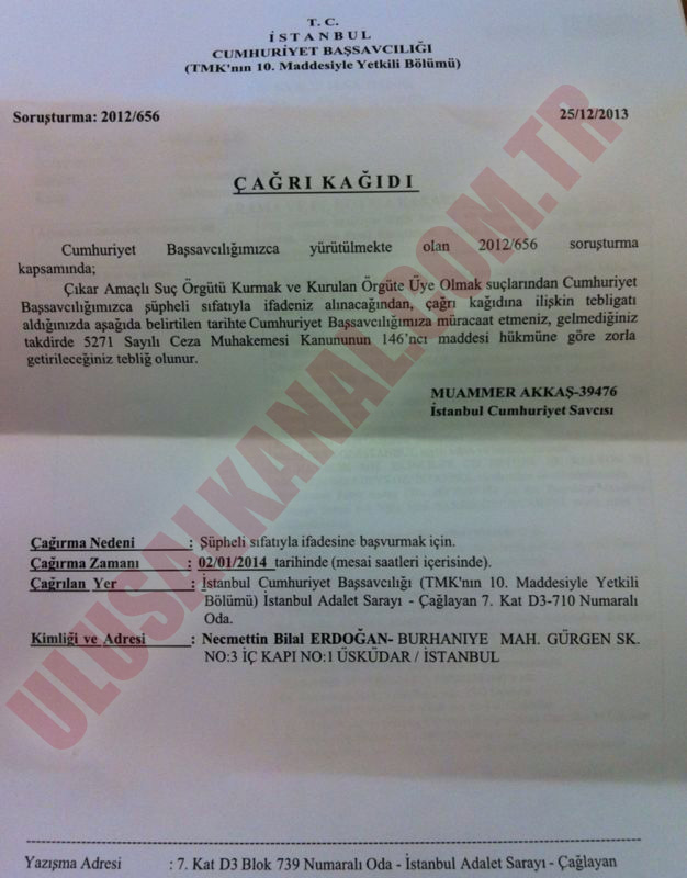 Muammer Akkaş'ta soruşturma dosyasının neden alındığı bu belgeyle anlaşıldı. Tayyip Erdoğan'ın oğlu Bilal Erdoğan soruşturma kapsamında ifade vermeye gitmezse polis tarafından zorla götürülecekti .